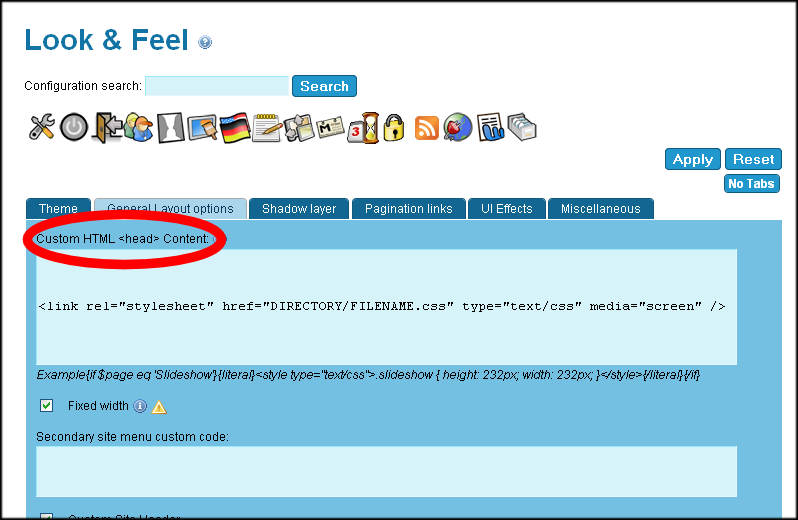 {NOTE()}Depending on your server configuration, storing CSS files in the Tiki file gallery may cause performance issues.{NOTE} - On the General Layout Options tab of the Admin: Look & Feel page, add the following to the Custom HTML <head> Content area: