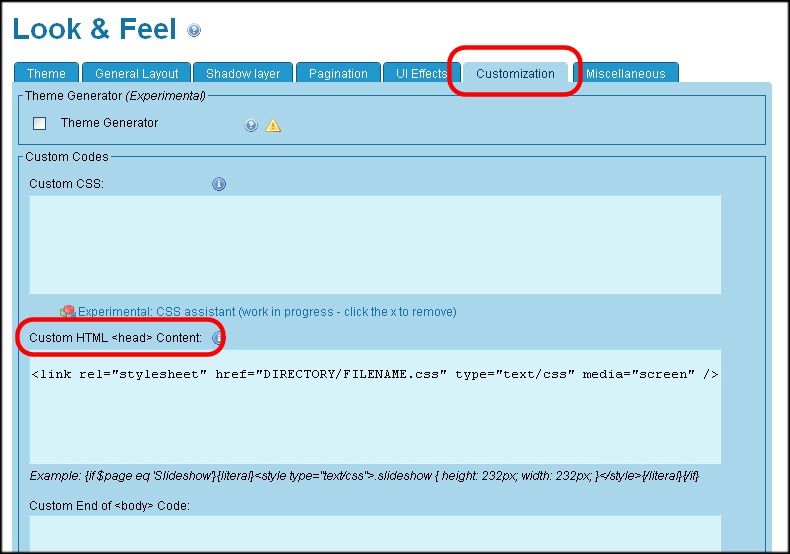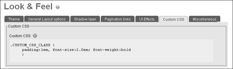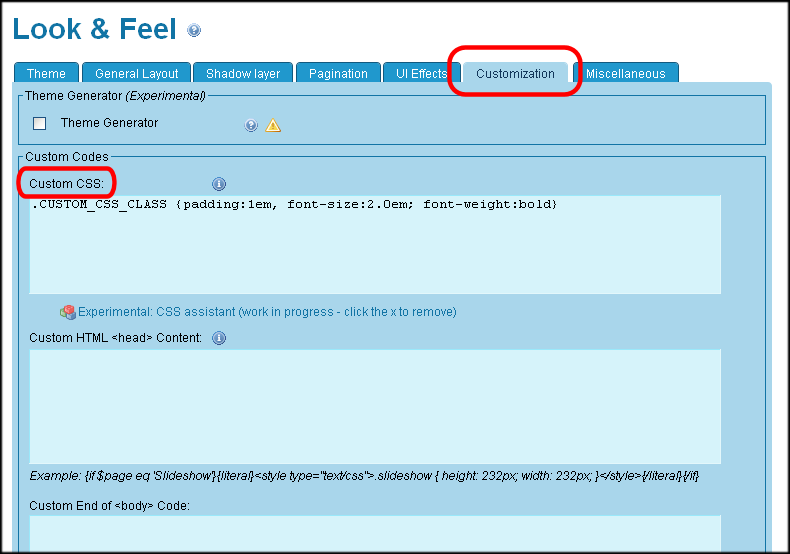 - On the Customization tab, type your CSS style definitions in the Custom CSS field.