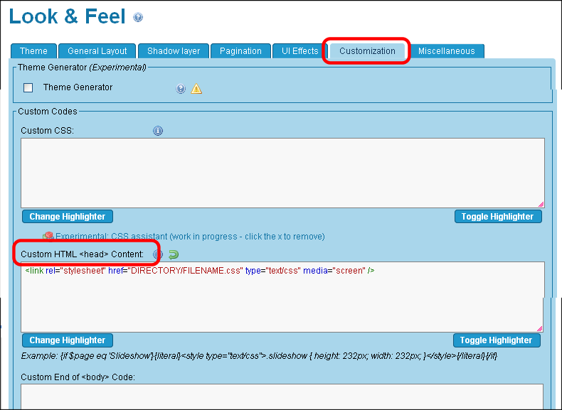 {NOTE()}Depending on your server configuration, storing CSS files in the Tiki file gallery may cause performance issues.{NOTE} - On the Customization tab of the Admin: Look & Feel page, add the following to the Custom HTML <head> Content area:
