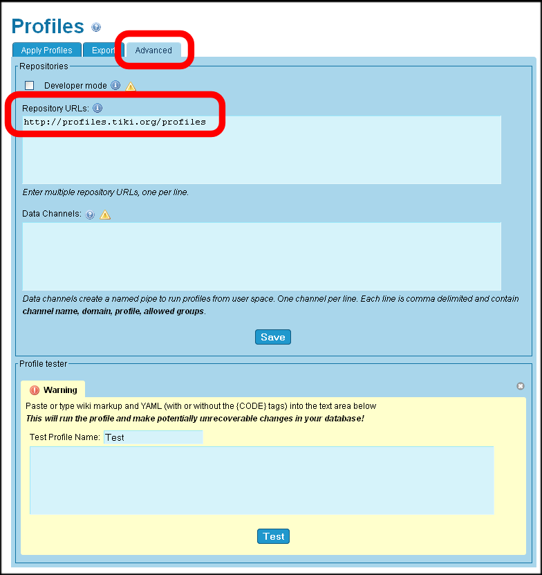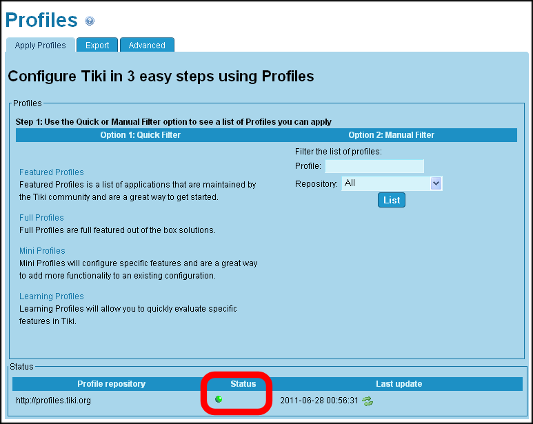 - On the Advanced tab of the Admin: Profiles page, add http://profiles.tikiwiki.org/profiles as a Repository URL.