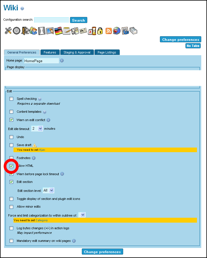 To allow HTML in wiki pages, you must enable the Allow HTML option on the General Preferences tab of the Admin: Wiki page.