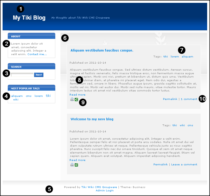 This example includes a single blog that allows comments. Each blog post can be tagged with keywords. These keywords appear in a Tag Cloud module in the left column.