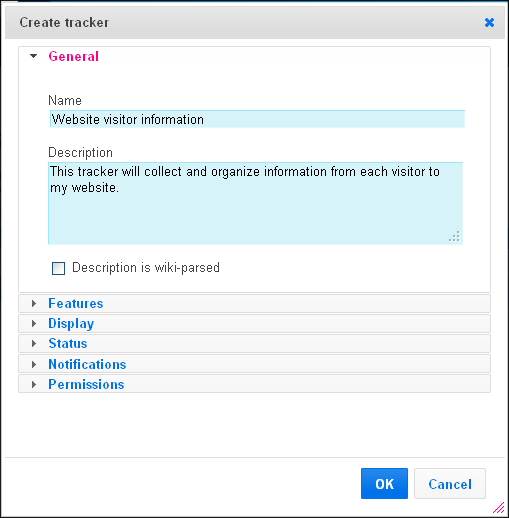 - Description: Enter a brief description of the tracker. Enable the Description text is wiki-parsed option to format the description with wiki syntax.
