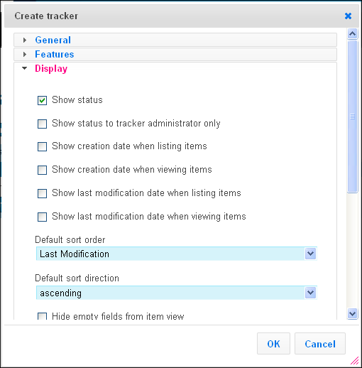 - Default sort... fields: Select the field to use as the default sort field (and its order) when listing tracker items. Since you have not added any tracker fields yet, you can only select the creation and last modified dates.