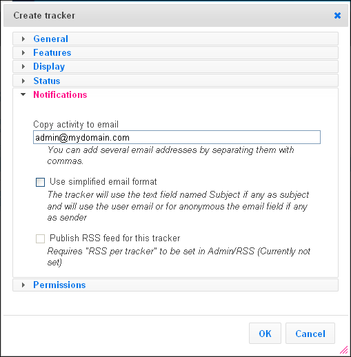 - Send copies of all activity...: Enter email addresses to receive notification of all activity (creating new items, editing or deleting items, changing status, etc.) for this tracker.