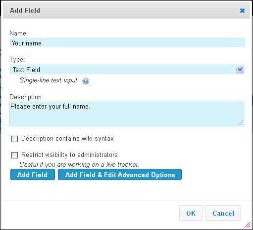 - On the Admin: Tracker page, Tracker fields tab, click Add field.
