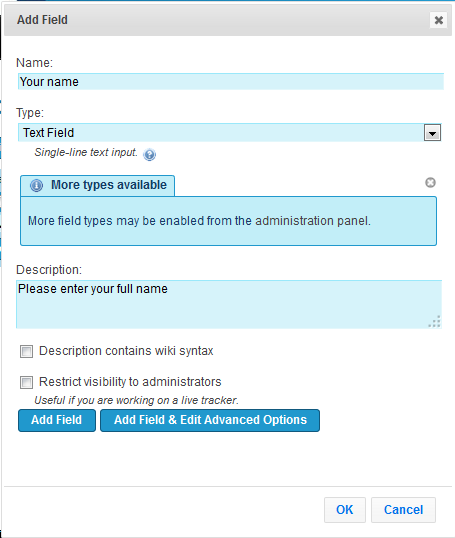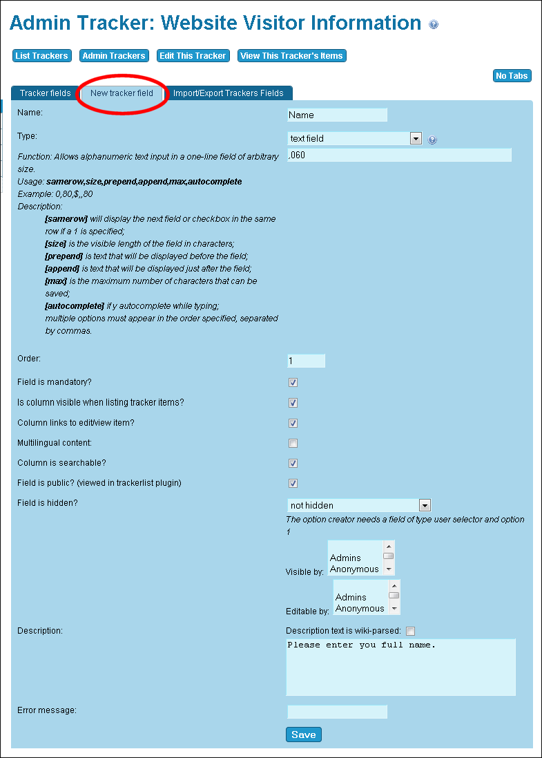 Leave the other fields as their defaults. - Click Save. Tiki adds the field to the tracker.