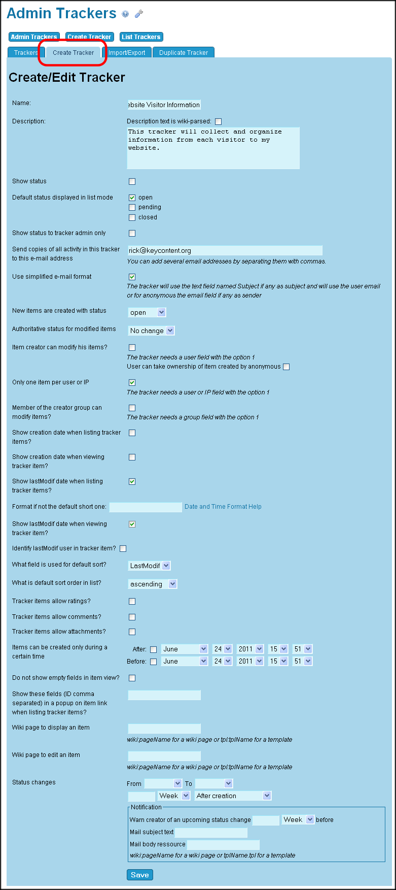 {NOTE}- Show date... fields: You can specify if the creation and last modified dates are shown when listing and viewing the tracker. You can also override the site's default date and time formats.